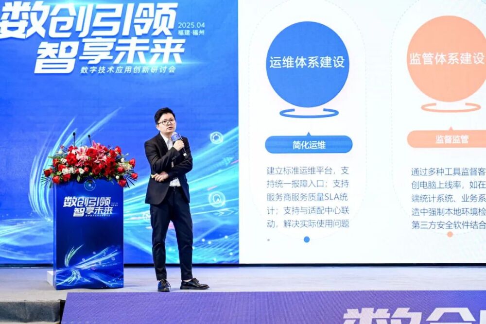 随后,升腾资讯信创解决方案经理孙锦华以“福建省信创运维服务保障体系建设”为主题进行分享,详细阐述了当下信创电脑运维服务存在的问题,提出了建设专业信创运维服务保障平台、服务网点建设,以及人才培养平台的体系化工程,同时还分享升腾资讯面向党政、金融、教育、医疗等场景的“信创+AI”解决方案。