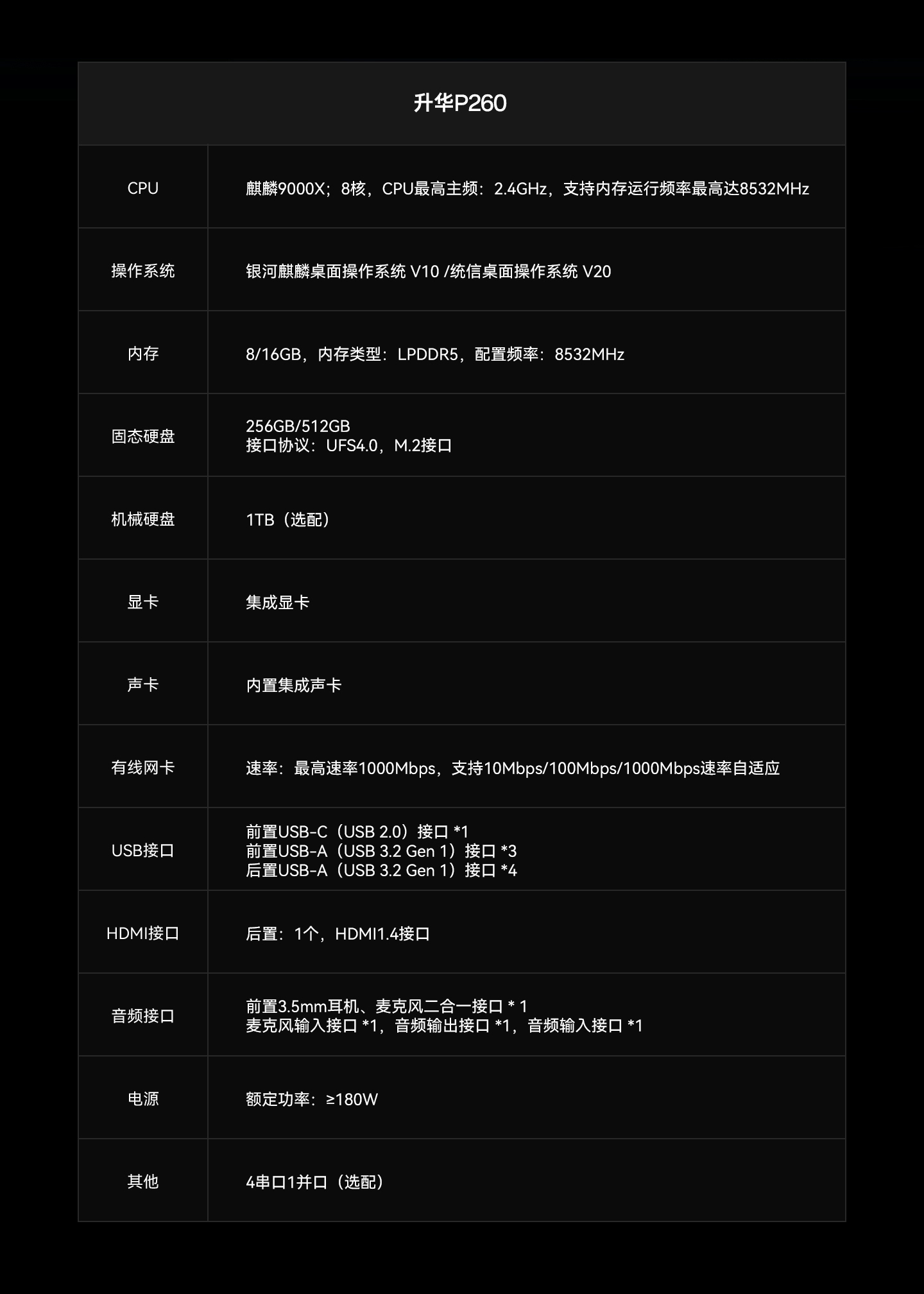 信创台式机升华P260 2,依托麒麟9000X处理器构筑核心算力底座,采用高性能LPDDR5X高速内存,内置UFS4.0高速固态硬盘,整体性能较上一代提升超20%,实现“算力高效输出、安全纵深防护、运行稳定长效”的三重核心优势。 产品搭载安全固件,深度兼容银河麒麟、统信UOS桌面操作系统,精准匹配政企、金融、能源、教育等关键领域高安全办公需求,为“自主可控、安全可靠”筑牢双重防线,树立国产信创终端新标杆。