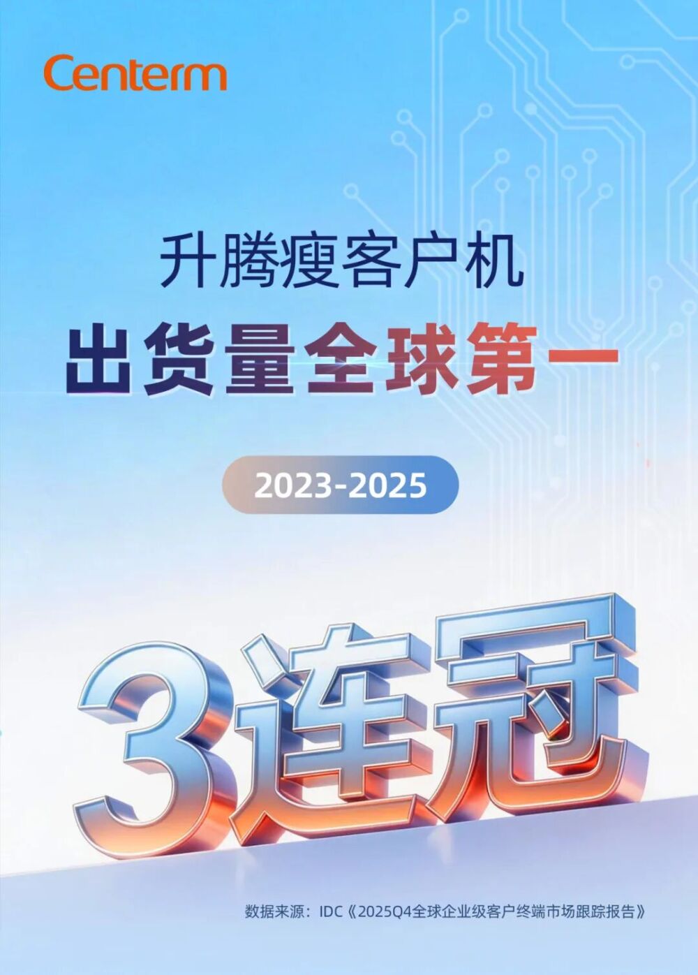 据国际数据公司IDC发布的《2025Q4全球企业级客户终端市场跟踪报告》显示,2025年度,升腾瘦客户机全球出货量强势领跑,出货量超78.99万台,连续十四年亚太(包含中国和日本)瘦客户机市场出货量第一,再度登顶全球第一!自2023年至2025年,这是升腾连续三年稳居该赛道榜首,成功实现全球“三连冠”!
