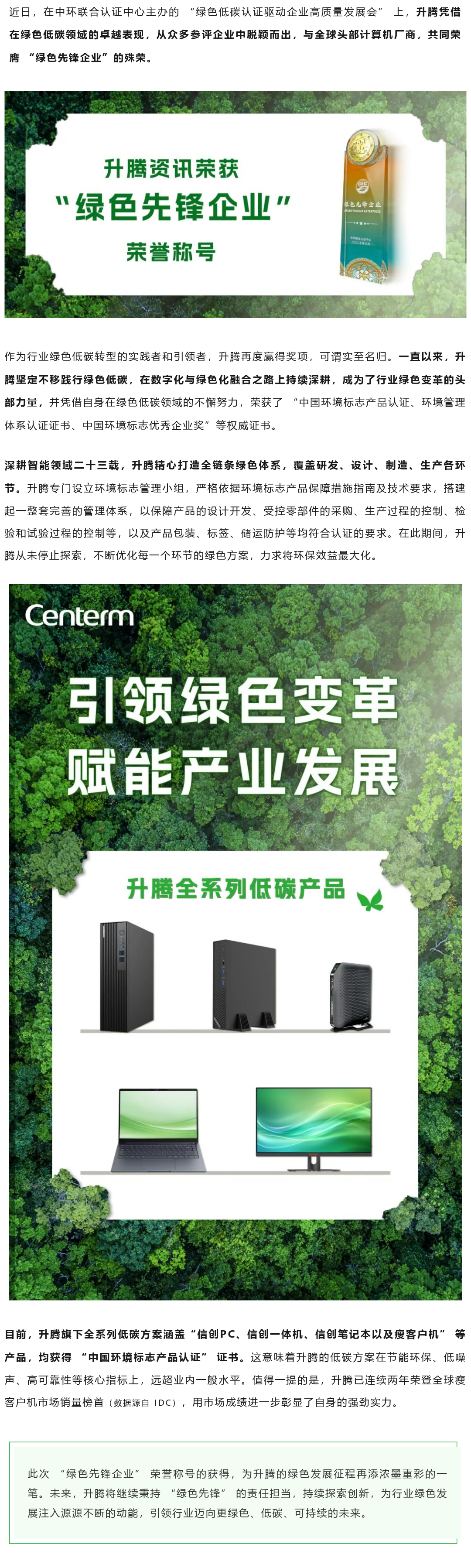 升腾荣膺“绿色先锋企业” 殊荣,持续引领行业绿色发展
