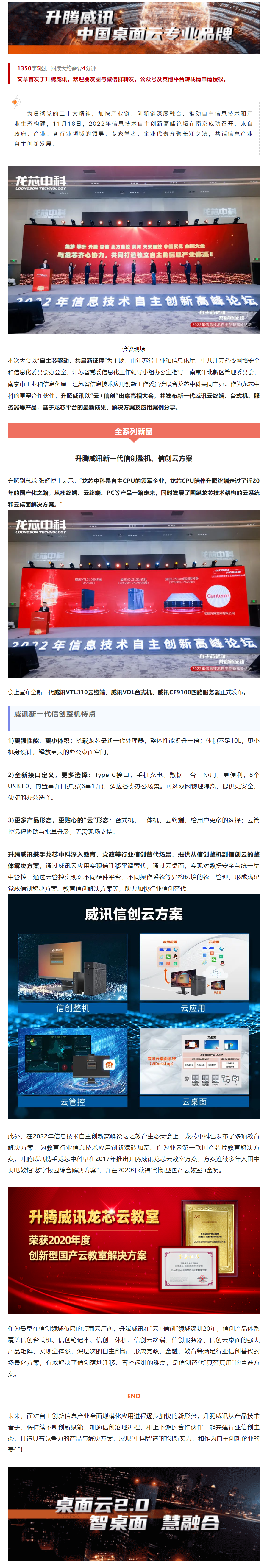 升腾威讯亮相龙芯中科2022年信创高峰论坛,携手共建共享“云+信创”新生态