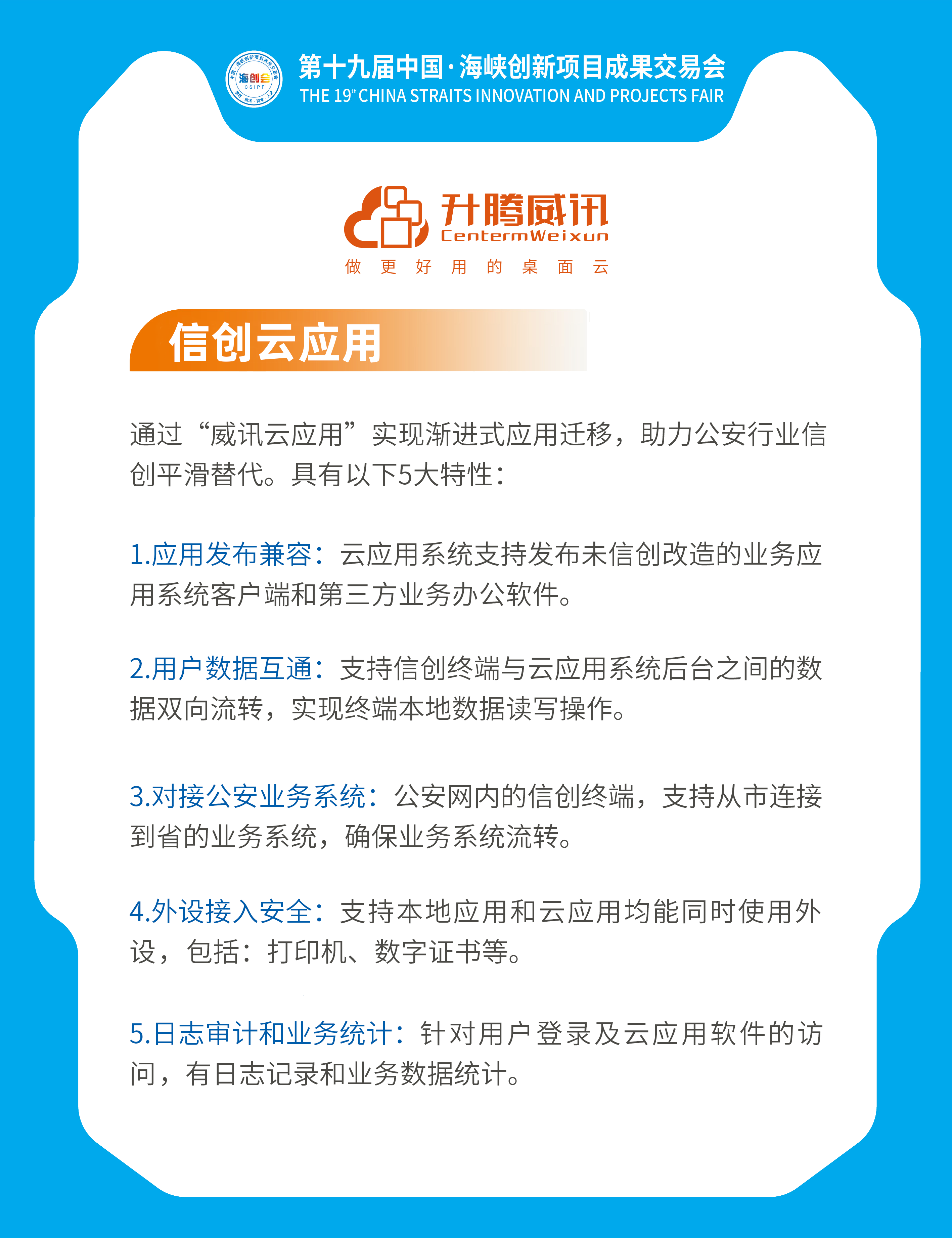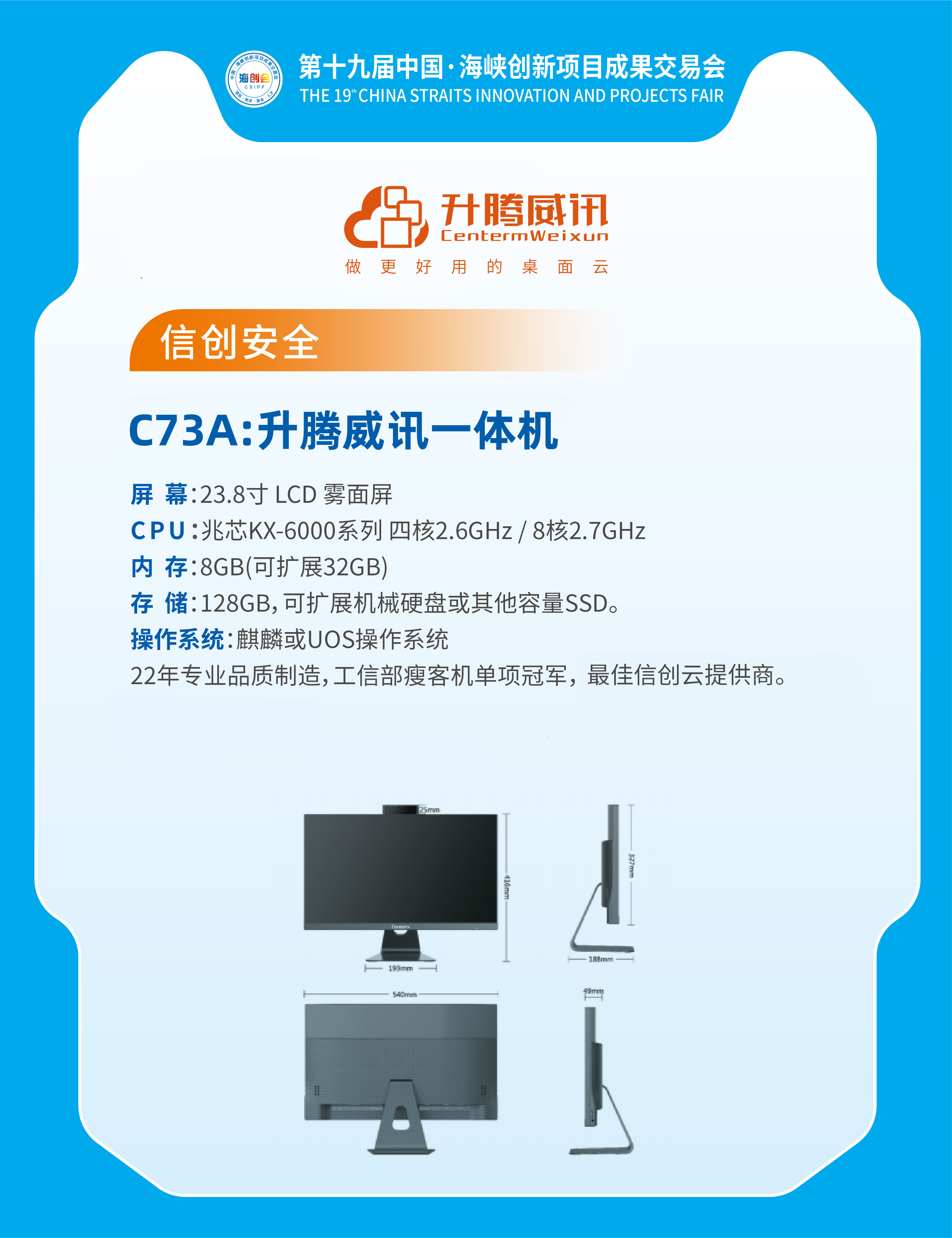 作为福建省优秀信创整机、信创云企业,升腾威讯以自主创新成果亮相2021海创会,在国企创新馆8A01、创新成果馆展出威讯信创一体机、威讯云应用系统产品,是业界最先推出从信创整机到云应用的整体方案,并带来在公安系统办公场景的应用案例。