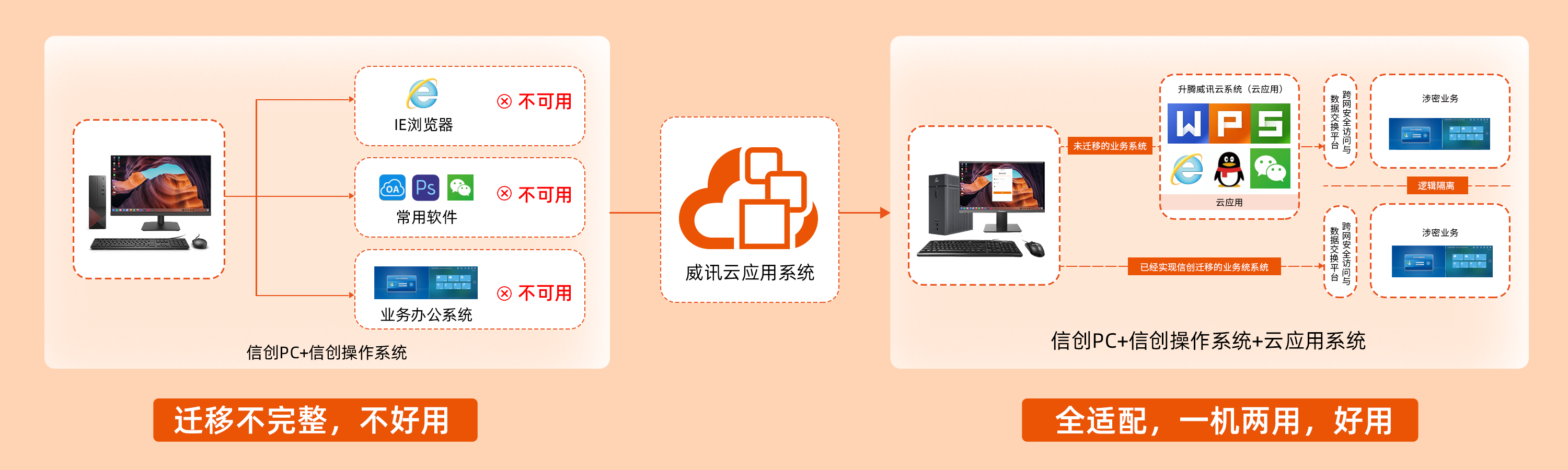 升腾威讯结合信创指导方向,发挥自研桌面云技术优势,充分考虑现阶段国产操作系统兼容性,率先通过建设威讯云应用系统,实现信创操作系统上访问未完成适配改造的公安信息网业务应用,实现在信创系统上采用一个相同的业务访问入口,让已经完成信创改造和未完成信创改造的公安业务应用系统均能够正常使用,实现信创终端“一机两用”,减少用户使用习惯的改变,培养用户信创办公环境习惯。