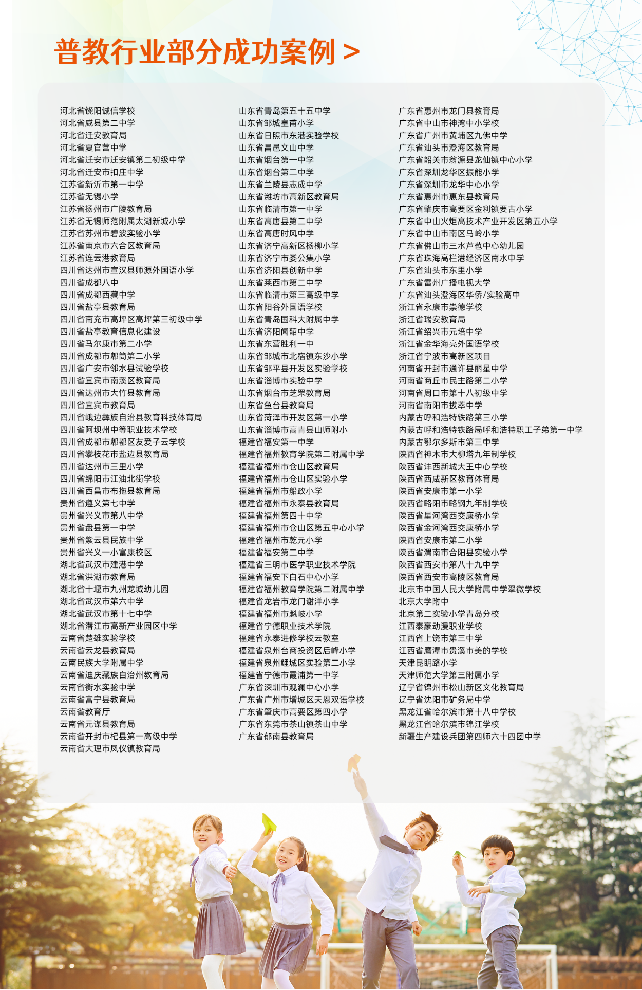 目前,通过融合行业、融合生态,融合行业应用场景,开放生态合作模式,与合作伙伴紧密合作,赋能合作伙伴,为用户提供真正好用的场景化整体解决方案,已经在全国福建、广东、湖北、湖南、云南、山东、四川等20个省市全面落地超2000所学校,落地超300000教师、学生桌面,全面领跑教育信息化2.0。