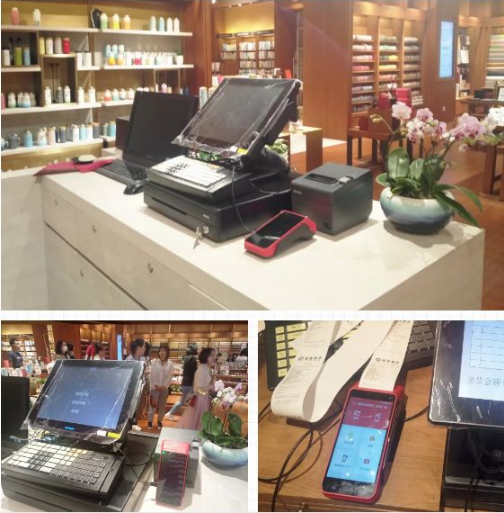 升腾智能POS可通过蓝牙、串口、USB接口3种模式轻松连接商场收银系统进行升级换代。其中采用蓝牙连接打造无线智能MIS系统,收银员可以摆脱数据线的束缚,实现移动收单。