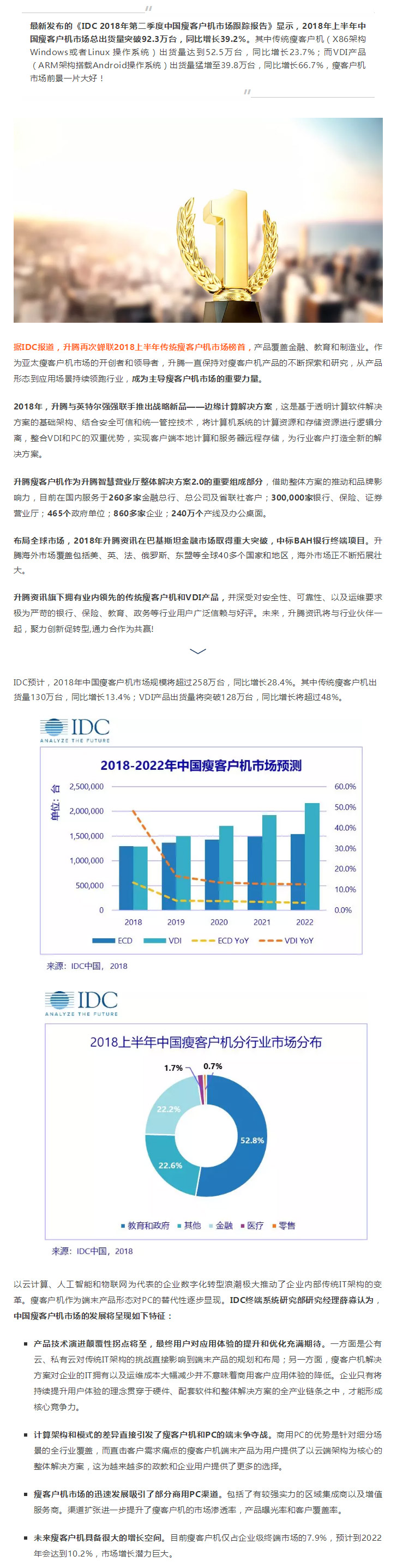 绝对NO.1!升腾资讯位居2018上半年中国传统瘦客户机市场榜首,瘦客户机市场一路高涨!