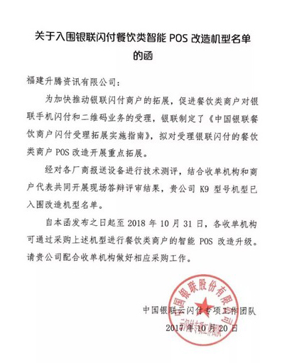 近日,银联发布《银联闪付餐饮类智能POS改造机型名单》,仅10家POS终端厂家入围。升腾智能POS K9凭借强性能、高安全、好口碑的优势荣耀上榜,助力银联拓展餐饮类重点商户,推广银联手机闪付和二维码业务。此次K9入围银联闪付餐饮类智能POS改造机型名单,是银联对于升腾综合实力的认可,同时为升腾智能POS后续在收单机构的推广工作注入新动能。