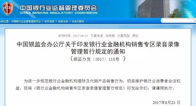 为了规范销售市场秩序和银行业金融机构自有理财产品及代销产品销售行为,有效治理误导销售、私售“飞单”等问题,切实加强行为监管并维护银行业消费者合法权益,银监会近日发布《银行业金融机构销售专区录音录像管理暂行规定》(以下简称《暂行规定》),要求银行业金融机构实施专区“双录”,即设立销售专区并在销售专区内装配电子系统,对自有理财产品及代销产品销售过程同步录音录像。