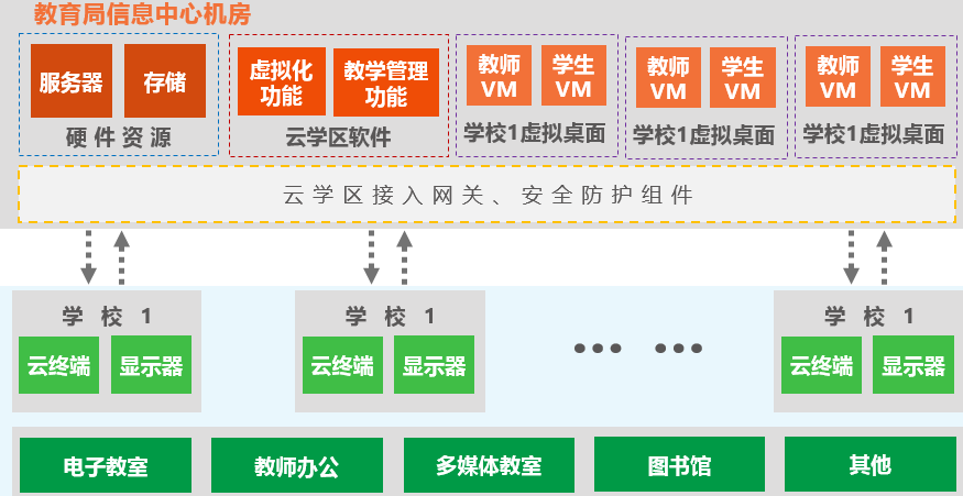 2015年以来教育桌面云发展迅速,但是各类产品仍以单个电子教室的分布式建设模式为主,而分布式建设的教室系统不能完全发挥云计算优势。云学区孕育而生,将资源集中部署于教育局信息中心,面向区县内所有学校提供桌面服务,充分利用资源,实现桌面统一管理,从而节约建设成本、简化系统管理运维!
