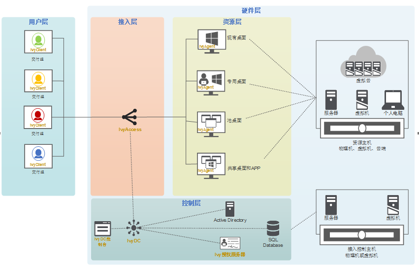 IvyCloud专业版V2.0桌面云系统由应用虚拟化模块(IvySphere)、虚拟化基础平台管理系统(IvyCenter)、桌面与应用交付控制模块(IvyDC)、用户接入管理模块(IvyAccess)、用户桌面客户端(IvyClient)等功能模块组成。相比其他桌面云系统架构,IvyCloud专业版2.0更清晰更简洁,以降低安装部署的难度,让用户操作更轻松。