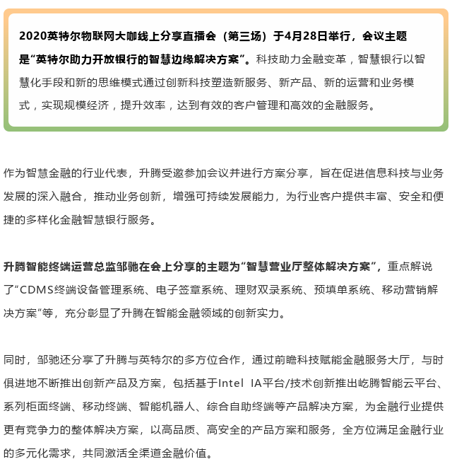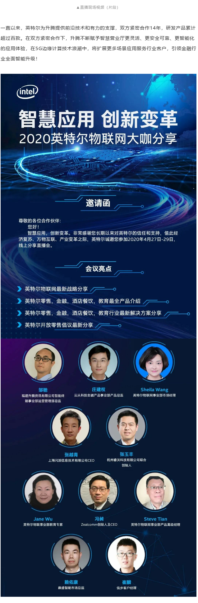 升腾亮相2020英特尔物联网大咖线上分享直播会